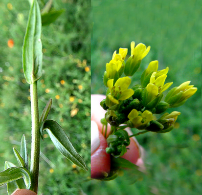 Nous avons trouvé dans un champ fleuri, semé, une brassicacée à fleurs jaunes et à feuilles simples allongées. J’ai pris des photos des fruits, des fleurs et des feuilles. Je suis arrivée à camelina microcarpa.
