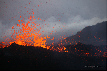 - Dans la zone2, l'accumulation  de petits morceaux arrondis de basalte bulleux qu'on trouve au dessus de l'argile cuite, me fait penser à un empilement de projections en début d’éruption, provoqué par des fontaines de lave Voir photo ci dessous : le magma (mélange de basalte fondu et de gaz volcaniques-H2O, CO2, gaz soufrés....) quand il atteint la surface, perd ses gaz dans l'air, facilement puisqu'il est fluide. Les gaz sous pression en début d’éruption font gicler en l'air des paquets de lave. Ces giclées accumulées au sol, peuvent peut être correspondre à la roche de la zone 2. De plus on peut suivre cet affleurement à l'ouest sous le sommet de Valros. Le magma fusait par une faille ou une fracture. A confirmer en explorant plus largement le terrain et à faire confirmer par un vulcanologue, mais je ne vois pas d'autres explications.